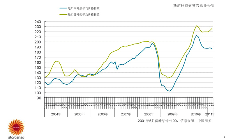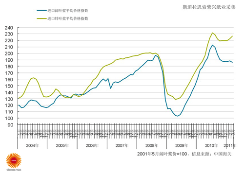 國內進口紙漿價格指數趨勢圖(2001年5月份=100)