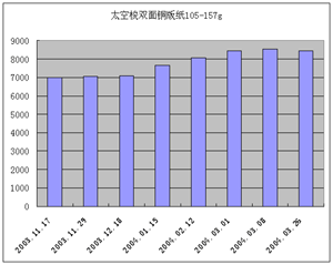 從2003年12月開始,金東開始了一波緊勢一波的漲價浪潮,太空梭80g銅版紙從8000元猛增到現(xiàn)在的9000元,其105-250g銅版紙上漲幅度更大,接近上漲1400元/噸,目前價格達到8500元/噸。銅版紙價格漲幅在不到兩個月的時間內(nèi)竟然達到12%-18%,,漲幅之大,時間之快,今年罕見。