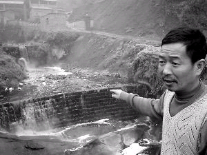 61歲的村民夏西固正在小河邊鏟黑色的淤泥。他抱怨說,紙廠排出的廢水、廢物大量淤積,遇上洪水,河兩岸100多畝稻田要遭殃。現在,這條小河完全成了一條污水河,“鴨子喝了污水都會死”。