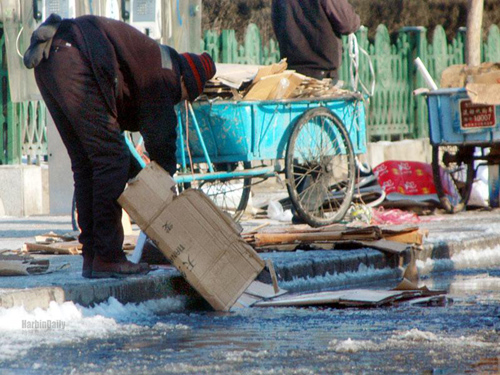 8日上午9時許,在哈市道外區靖宇公園門前,一個收廢品的小販為了將收來的紙殼箱賣出更多的重量,竟將部分紙殼箱泡在水里,而后用干的紙殼箱包住濕的紙殼箱,然后去賣給廢品收購站,這種欺騙實在不應該。