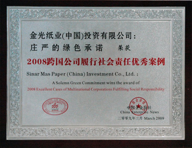 2009年3月31日,由中國企業報和中國企業CSR研究中心主辦的“2009跨國公司社會責任研討會”在北京召開,會議隆重推出歷經一年評選產生的“2008跨國公司履行社會責任案例榜”。APP(中國)憑借“立足中國,綠色承諾”可持續發展項目在眾多企業社會責任案例中脫穎而出并榮登優秀案例榜單。