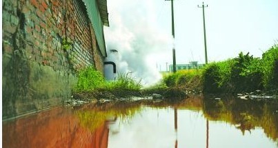 紅色的污水順著造紙廠的墻壁向外排