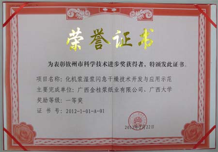 近日,廣西欽州市市委、市政府在市文化藝術中心隆重召開重大項目、重大活動表彰大會,總結成功經驗,表彰獎勵先進廣西金桂漿紙業有限公司的“化機漿濕漿閃急干燥技術開發與應用示范”作為欽州市重大項目,獲得了“欽州市科學技術進步獎一等獎”的榮譽稱號,欽州市市長李新元向金桂公司代表頒發了獲獎榮譽證書。