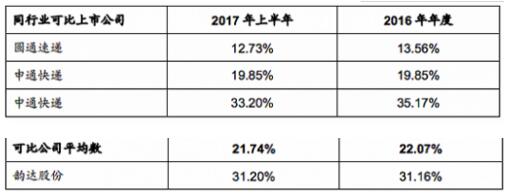 圓通財報中并未列出第三季度財務數據,由前三季度減去上半年數據得出 雖然韻達的營業收入低于圓通,但凈利潤及增長速度已高于圓通。 兩者收入差別大,是因為兩者與同行業快遞公司的“派送費”業務模式不盡相同。韻達在《關于深圳證券交易所對公司2017年半年報問詢函的回復公告》中解釋道:“公司為攬件/派件加盟網點之間就‘派送費’的直接結算提供技術平臺,‘派送費’相應由攬件加盟商網點承擔,公司對上述‘派送費’不確認收入、成本。” 也就是說,由網點雙方支付的“派費”并不通過總部進行,不計入總部的營業收入中,所以營收實際差別并不大。在三通一達中,中通與韻達都是采取上述計算方法,所以導致毛利率大幅高于申通和圓通。