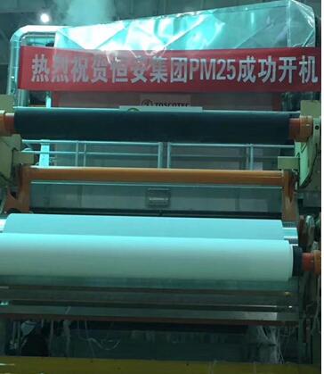 恒安紙業(yè)(昌吉)有限公司一期項目第一臺紙機于11月12日成功開機出紙。該機臺是恒安集團的第25號機,紙機凈紙幅寬2850mm,設(shè)計車速1600m/min,要使用商品木漿原料生產(chǎn)高檔生活用紙,年產(chǎn)量可達2.5萬噸。