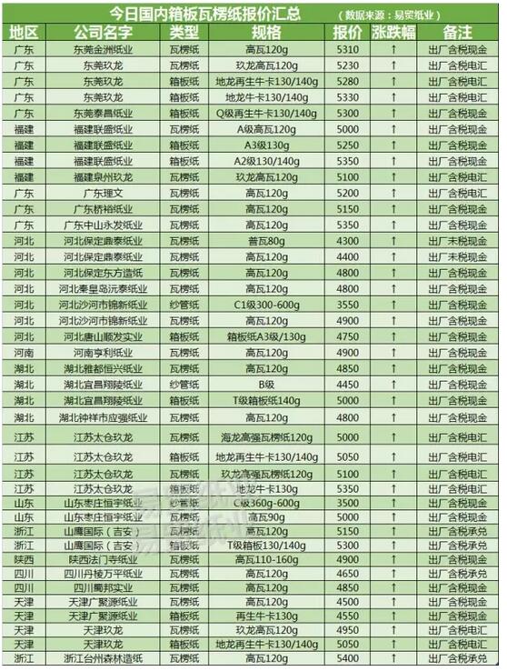 據易貿紙業5月10日消息,多數紙企本周廢紙價格出現幾連漲,累計漲幅超過1000元/噸,當前市場看漲情緒繼續蔓延。受廢紙暴漲帶動,玖龍、理文等全國主流紙廠瓦楞箱板紙價格已經突破5300元/噸。 廢紙:多數紙企本周累計漲幅超1000元/噸,看漲情緒繼續蔓延 今日國內廢舊黃板紙漲勢繼續蔓延,市場看漲情緒繼續蔓延,95%以上市場人士對后市看好。政策近期若無變動,5月份廢紙價格或將保持高位,隨著5月10日玖龍紙業各基地上調300-400元/噸,市場再添一波上漲熱潮,多數紙企本周累計漲幅超過1000元/噸,原料和成品紙庫存均在低位,保持快進快出生產節奏,以緩解后期價格回落帶來的風險。 易貿紙業預測:外廢進口受限短時間內引發國廢價格上漲,但市場需求平淡打擊市場大漲熱情,因而多數紙企保持理性對待后市,低庫存運行,原紙價格或短期內仍將保持大幅上漲走勢。 主流紙廠報價:箱板紙最高價5350元/噸,瓦楞紙5400元/噸 易貿紙業數據監測,5月10日國內主流紙廠箱板紙最高價5350元/噸,瓦楞紙最高價5400元/噸(含稅現金或電匯)。具體價格請看下圖表格中的數據: 5月10日紙廠價格一覽