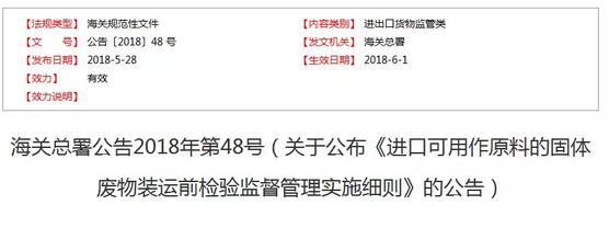 根據《進口可用作原料的固體廢物檢驗檢疫監督管理辦法》,海關總署制定了《進口可用作原料的固體廢物裝運前檢驗監督管理實施細則》,自2018年6月1日起執行。 進口廢物新準則于6月1日起執行,各需進口廢紙的紙企應知曉。 特此公告。 海關總署 2018年5月28日 進口可用作原料的固體廢物裝運前檢驗監督管理實施細則 第一章總則 第一條為加強和規范對進口可用作原料的固體廢物(以下簡稱“廢物原料”)裝運前檢驗和裝運前檢驗機構的監督管理,根據《中華人民共和國進出口商品檢驗法實施條例》《進口可用作原料的固體廢物檢驗檢疫監督管理辦法》,制定本細則。 第二條本細則適用于進口廢物原料裝運前檢驗活動、裝運前檢驗機構的備案管理,以及相關的監督管理工作。 第三條海關總署負責對裝運前檢驗實施監督管理,對裝運前檢驗機構實施備案管理,并對其活動依法實施監督管理。 第四條海關總署不予指定檢驗機構從事進口廢物原料裝運前檢驗。 第五條海關總署對進口廢物原料裝運前檢驗機構實施備案管理。第三方檢驗機構在從事廢物原料裝運前檢驗業務之前,應當向海關總署提出備案申請。 第六條海關總署對裝運前檢驗機構實施風險預警及快速反應管理。 第七條裝運前檢驗機構應當遵守中國相關法律法規和海關總署的有關規定,以第三方身份獨立、公正地開展進口廢物原料裝運前檢驗工作,并對其所出具的裝運前檢驗證書的真實性、準確性負責。 第八條裝運前檢驗機構及其關聯機構不能申請或者代理申請供貨商注冊登記,不能從事廢物原料的生產和經營活動。 第二章裝運前檢驗 第九條裝運前檢驗是指在進口廢物原料運往中國境內之前,依照中國法律法規、國家環境保護控制標準和國家技術規范的其他強制性要求,以及裝運前檢驗規程等的要求,由裝運前檢驗機構對其進行檢驗、監裝和施加封識,然后出具裝運前檢驗證書的行為。 第十條裝運前檢驗機構應當在進口廢物原料的境外裝貨地或者發貨地,按照中國國家環境保護控制標準、相關技術規范的強制性要求和裝運前檢驗規程實施裝運前檢驗。 第十一條根據裝運前檢驗工作質量風險特性與管理要求,裝運前檢驗機構應當在其合法注冊所在的國家或地區開展裝運前檢驗活動。 第十二條裝運前檢驗機構應當具備與其實施裝運前檢驗活動相適應的規模、檢驗人員數量和檢驗設施設備,確保經其檢驗的廢物原料符合中國法律法規、國家環境保護控制標準和國家技術規范的其他強制性要求。 第十三條裝運前檢驗機構應當分別設置檢驗、授權簽字等關鍵崗位,保持相互獨立,同時制定任職的專業背景條件,持續接受業務培訓和教育,確保檢驗員、授權簽字人熟悉掌握與廢物原料有關的中國法律法規、國家環境保護控制標準和國家技術規范的其他強制性要求,以及相關的管理規定。 第十四條裝運前檢驗機構應當依據本細則第十條的規定,制定適合本機構情況的裝運前檢驗工作程序或者作業指導書,規范現場裝運前檢驗活動。 第十五條裝運前檢驗機構應當依靠自身檢驗能力,完整地實施檢驗、監裝和施加封識等工作程序,并對其工作質量負全責,不得委托其他機構、組織或人員實施。 第十六條裝運前檢驗機構應當以適當方式,真實、完整、可追溯地記錄其實施的裝運前檢驗活動過程,并妥善貯存、保管檢驗原始記錄,至少保存5年。 第三章備案管理 第十七條裝運前檢驗機構應當提前向海關總署備案,并提交以下材料: 。ㄒ唬﹤浒干暾垥 。ǘ┙浌C的所在國家(地區)合法注冊的第三方檢驗機構資質證明; 。ㄈ┕潭ǖ霓k公地點、檢驗場所使用權證明材料;辦公場所和經營場所平面圖,能全面展現上述場所實景的視頻或者5張以上照片; 。ㄋ模㊣SO/IEC17020體系認證證書彩色復印件及相關質量管理體系文件; 。ㄎ澹⿵氖卵b運前檢驗的廢物原料種類; 。┭b運前檢驗證書授權簽字人信息及印簽樣式; 。ㄆ撸┕菊鲁獭 提交的備案申請材料應當使用中文或者中英文對照文本。 第十八條備案申請人在準備好申請材料后,將全套材料提交海關總署,以海關總署收到的書面申請資料為準。 第十九條海關總署在收到備案申請書面材料后,根據下列情況分別處理: 。ㄒ唬﹤浒干暾埐牧喜积R全,或者不符合要求的,當場或者5個工作日內一次性告知備案申請人需要補正的全部內容,要求備案申請人須在30天內補正完畢; 。ǘ﹤浒干暾埐牧淆R全、符合要求的,或者備案申請人補正材料后,經審查材料齊全、符合規定要求的,予以受理; 。ㄈ┯馄谖囱a正的,終止辦理備案; (四)未按照要求全部補正備案申請材料或者補正后備案申請材料仍不符合要求的,不予受理。 第二十條海關總署自受理裝運前檢驗機構備案申請之日起10個工作日內組成專家組,按照《進口可用作原料的固體廢物裝運前檢驗機構備案審核記錄表》的要求,審核申請人資格、申請材料的完整性、符合性等情況。 專家組應當在審核工作結束后作出審核結論,向海關總署提交審核報告。 第二十一條海關總署自收到審核報告之日起10個工作日內作出是否同意備案的意見。審核合格的,同意備案,簽發《進口可用作原料的固體廢物裝運前檢驗機構備案證書》;審核不合格的,不予備案。 第二十二條海關總署自受理備案申請之日起20個工作日內作出同意備案或不予備案的