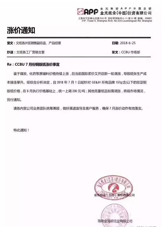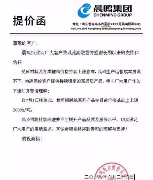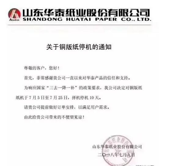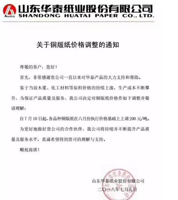 對產能的控制,不僅僅是紙企應對市場的招數,更是國家政策導向。在終端需求穩定的狀況下,停機有助于紙廠和渠道快速消化庫存,隨著漿價的穩定,紙價整體將受到一定支撐。 龍頭漲價函: 山東華泰紙業股份有限公司:鑒于當前木漿、化工材料等原材料價格的持續上漲,生產成本不斷攀升,為保證產品質量及服務,自7月10日起,各品種銅版紙在六月份執行價格基礎上上調200元/噸。