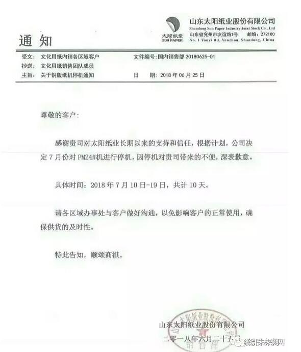 山東太陽紙業股份有限公司:公司決定7月份對PM24#機,因停機對貴司帶來的不便,深表歉意。具體時間:2018年7月10日—19日,共計10天。