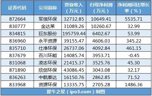 年環保政策再迎密集落地期,《中華人民共和國環境保護稅法》、《生態環境損害賠償制度改革方案》,以及新修訂的《中華人民共和國水污染防治法》等多部重量級環保政策在今年正式生效。 隨著多項政策的相繼落地實施,環保監管力度明顯加大,環保督察逐漸常態化,走穴式監察使得環保生態強度深化,我國節能環保市場空間進一步擴大。而新三板環保行業擁有近400家公司,覆蓋了大氣治理、水治理、固廢治理等各個細分領域,成為我國環保市場的“主力軍”。 上半年業績穩健 頭部企業表現亮眼 據犀牛之星研究中心統計,今年上半年新三板環保企業資產總額和營業收入分別為831.14億元、211.68億元,同比分別增長26.31%、25.05%,總體規模較去年同期有所擴張;實現利潤總額和凈利潤分別為19.77億元、15.89億元,同比增長50.46%、51.91%,利潤率等盈利能力綜合指數表現有所回暖。 數量上來看,除去未披露半年報的13家企業,上半年381家三板環保企業中有259家企業實現盈利,占總體的67.98%,整體業績表現較為穩健。 三板環保行業中的幾家頭部企業業績相當亮眼。以軍信環保(872664)為例,上半年公司實現營業收入3.27億元,同比增長437.60%,凈利潤為1.06億元,較上年同期的188.96萬元增長幅度達5535.71%。 業績大幅增長,軍信環保表示,主要是由于上半年公司新增了滲瀝液(污水)處理和垃圾填埋處理業務以及子公司新增了垃圾焚燒處理業務、發電業務及飛灰處理業務。上半年滲瀝液(污水)處理和垃圾填埋處理業務增加收入8666.12萬元,垃圾焚燒處理業務、發電業務及飛灰處理業務增加收入1.57億元,同時新增業務毛利率較高也帶動了公司總體毛利率的上升。 另一家企業金達萊(830777)的表現也是可圈可點,上半年公司實現營收3.11億元,同比增長42.70%,歸母凈利潤增長32.99%達1.03億元。據了解,金達萊2017年度進行了分紅,公司豪派1.24億元現金紅利給股東,可謂是掛牌公司里的“分紅大戶”。 需要注意的是,金達萊已于2017年10月提交了上市申請,目前公司正在接受招商證券的上市輔導。