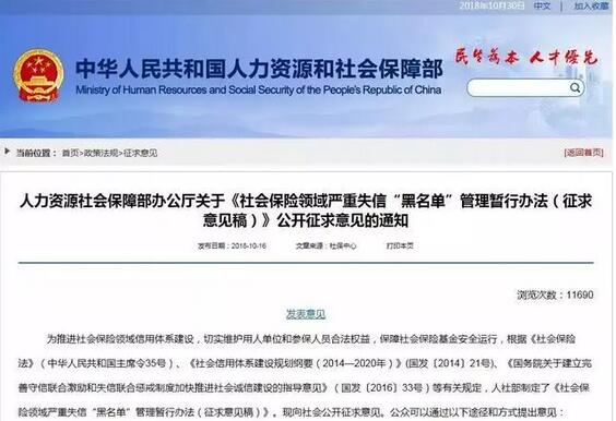 根據征求意見稿第5條規定,下面這6種情形擬列入社保“黑名單”: (一)用人單位未按相關規定參加社會保險且拒不整改的; (二)以欺詐、偽造證明材料或者其他手段參加、申報社會保險和騙取社會保險待遇或社會保險基金支出的; (三)非法獲取、出售或變相交易社會保險個人權益數據的; (四)社會保險服務機構違反服務協議或相關規定且拒不整改的; (五)負有償還義務的用人單位及其法人代表或第三人,拒不償還社會保險基金已先行支付工傷保險待遇的; (六)法律、行政法規規定的其他情形。 列入社保“黑名單”將受到哪些懲戒? 根據征求意見稿,各級社會保險經辦機構應當按照有關規定,將社保“黑名單”信息納入當地和全國信用信息共享平臺,由相關部門在各自職責范圍內依據《備忘錄》規定,在政府采購、交通出行、招投標、生產許可、資質審核、融資貸款、市場準入、稅收優惠、評優評先等方面予以限制。 社保“黑名單”實行動態管理,納入聯合懲戒期限一般不超過5年。 6種情形將列入住房公積金“黑名單”