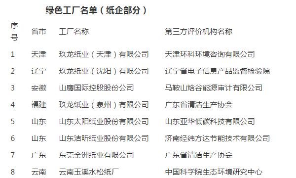為持續(xù)打造綠色制造先進(jìn)典型,引領(lǐng)相關(guān)領(lǐng)域工業(yè)綠色轉(zhuǎn)型,加快推動(dòng)綠色制造體系建設(shè),工業(yè)和信息化部開(kāi)展了第三批綠色制造名單推薦工作。經(jīng)申報(bào)單位自評(píng)價(jià)、第三方評(píng)價(jià)機(jī)構(gòu)評(píng)價(jià)、省級(jí)工業(yè)和信息化主管部門評(píng)估確認(rèn)及專家論證、公示等環(huán)節(jié),確定了第三批綠色制造名單,共計(jì)391家企業(yè)被評(píng)為綠色工廠,其中包括了山鷹、玖龍、太陽(yáng)等8家紙企,詳情如下表所示: