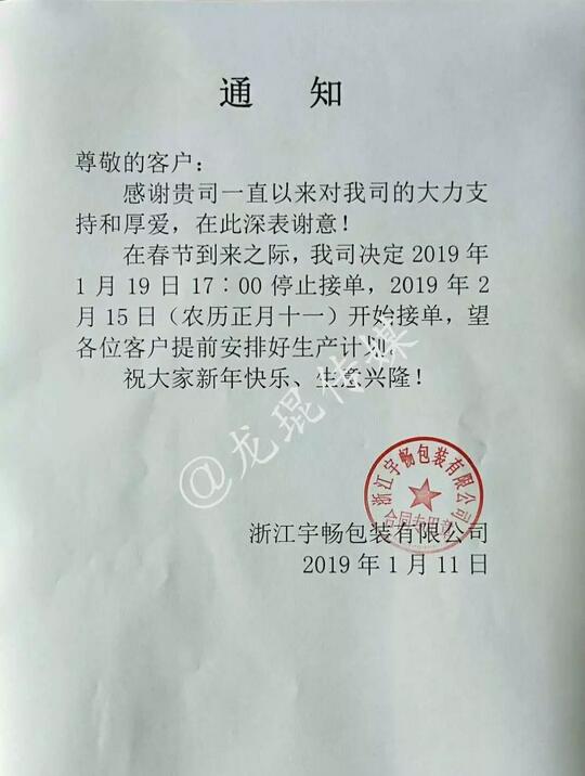 此外,浙江宇暢包裝有限公司還發(fā)布了放假通知,表示2019年1月19日17:00將停止接單,2019年2月15日開始接單。如今時(shí)間已至1月12號,距離浙江宇暢包裝有限公司放假僅有一個(gè)星期的時(shí)間。