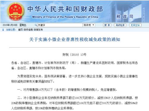 關(guān)于實(shí)施小微企業(yè)普惠性稅收減免政策的通知 財(cái)稅〔2019〕13號 各省、自治區(qū)、直轄市、計(jì)劃單列市財(cái)政廳(局),新疆生產(chǎn)建設(shè)兵團(tuán)財(cái)政局,國家稅務(wù)總局各省、自治區(qū)、直轄市和計(jì)劃單列市稅務(wù)局: 為貫徹落實(shí)黨中央、國務(wù)院決策部署,進(jìn)一步支持小微企業(yè)發(fā)展,現(xiàn)就實(shí)施小微企業(yè)普惠性稅收減免政策有關(guān)事項(xiàng)通知如下: 一、對月銷售額10萬元以下(含本數(shù))的增值稅小規(guī)模納稅人,免征增值稅。 二、對小型微利企業(yè)年應(yīng)納稅所得額不超過100萬元的部分,減按25%計(jì)入應(yīng)納稅所得額,按20%的稅率繳納企業(yè)所得稅;對年應(yīng)納稅所得額超過100萬元但不超過300萬元的部分,減按50%計(jì)入應(yīng)納稅所得額,按20%的稅率繳納企業(yè)所得稅。 上述小型微利企業(yè)是指從事國家非限制和禁止行業(yè),且同時(shí)符合年度應(yīng)納稅所得額不超過300萬元、從業(yè)人數(shù)不超過300人、資產(chǎn)總額不超過5000萬元等三個條件的企業(yè)。 從業(yè)人數(shù),包括與企業(yè)建立勞動關(guān)系的職工人數(shù)和企業(yè)接受的勞務(wù)派遣用工人數(shù)。所稱從業(yè)人數(shù)和資產(chǎn)總額指標(biāo),應(yīng)按企業(yè)全年的季度平均值確定。具體計(jì)算公式如下: 季度平均值=(季初值+季末值)÷2 全年季度平均值=全年各季度平均值之和÷4 年度中間開業(yè)或者終止經(jīng)營活動的,以其實(shí)際經(jīng)營期作為一個納稅年度確定上述相關(guān)指標(biāo)。 三、由省、自治區(qū)、直轄市人民政府根據(jù)本地區(qū)實(shí)際情況,以及宏觀調(diào)控需要確定,對增值稅小規(guī)模納稅人可以在50%的稅額幅度內(nèi)減征資源稅、城市維護(hù)建設(shè)稅、房產(chǎn)稅、城鎮(zhèn)土地使用稅、印花稅(不含證券交易印花稅)、耕地占用稅和教育費(fèi)附加、地方教育附加。 四、增值稅小規(guī)模納稅人已依法享受資源稅、城市維護(hù)建設(shè)稅、房產(chǎn)稅、城鎮(zhèn)土地使用稅、印花稅、耕地占用稅、教育費(fèi)附加、地方教育附加其他優(yōu)惠政策的,可疊加享受本通知第三條規(guī)定的優(yōu)惠政策。 五、《財(cái)政部稅務(wù)總局關(guān)于創(chuàng)業(yè)投資企業(yè)和天使投資個人有關(guān)稅收政策的通知》(財(cái)稅〔2018〕55號)第二條第(一)項(xiàng)關(guān)于初創(chuàng)科技型企業(yè)條件中的“從業(yè)人數(shù)不超過200人”調(diào)整為“從業(yè)人數(shù)不超過300人”,“資產(chǎn)總額和年銷售收入均不超過3000萬元”調(diào)整為“資產(chǎn)總額和年銷售收入均不超過5000萬元”。 2019年1月1日至2021年12月31日期間發(fā)生的投資,投資滿2年且符合本通知規(guī)定和財(cái)稅〔2018〕55號文件規(guī)定的其他條件的,可以適用財(cái)稅〔2018〕55號文件規(guī)定的稅收政策。 2019年1月1日前2年內(nèi)發(fā)生的投資,自2019年1月1日起投資滿2年且符合本通知規(guī)定和財(cái)稅〔2018〕55號文件規(guī)定的其他條件的,可以適用財(cái)稅〔2018〕55號文件規(guī)定的稅收政策。 六、本通知執(zhí)行期限為2019年1月1日至2021年12月31日。《財(cái)政部稅務(wù)總局關(guān)于延續(xù)小微企業(yè)增值稅政策的通知》(財(cái)稅〔2017〕76號)、《財(cái)政部稅務(wù)總局關(guān)于進(jìn)一步擴(kuò)大小型微利企業(yè)所得稅優(yōu)惠政策范圍的通知》(財(cái)稅〔2018〕77號)同時(shí)廢止。 七、各級財(cái)稅部門要切實(shí)提高政治站位,深入貫徹落實(shí)黨中央、國務(wù)院減稅降費(fèi)的決策部署,充分認(rèn)識小微企業(yè)普惠性稅收減免的重要意義,切實(shí)承擔(dān)起抓落實(shí)的主體責(zé)任,將其作為一項(xiàng)重大任務(wù),加強(qiáng)組織領(lǐng)導(dǎo),精心籌劃部署,不折不扣落實(shí)到位。要加大力度、創(chuàng)新方式,強(qiáng)化宣傳輔導(dǎo),優(yōu)化納稅服務(wù),增進(jìn)辦稅便利,確保納稅人和繳費(fèi)人實(shí)打?qū)嵪硎艿綔p稅降費(fèi)的政策紅利。要密切跟蹤政策執(zhí)行情況,加強(qiáng)調(diào)查研究,對政策執(zhí)行中各方反映的突出問題和意見建議,要及時(shí)向財(cái)政部和稅務(wù)總局反饋。 財(cái)政部稅務(wù)總局 2019年1月17日