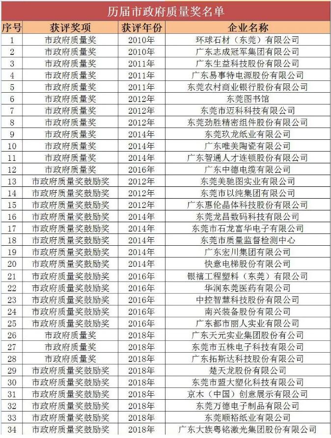 《東莞市人民政府關(guān)于2018年東莞市政府質(zhì)量獎及鼓勵獲企業(yè)的通報(bào)》日前在東莞市政府官網(wǎng)正式發(fā)布,意味著這項(xiàng)兩年評選一次的東莞最高質(zhì)量獎項(xiàng)正式出爐。