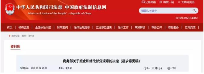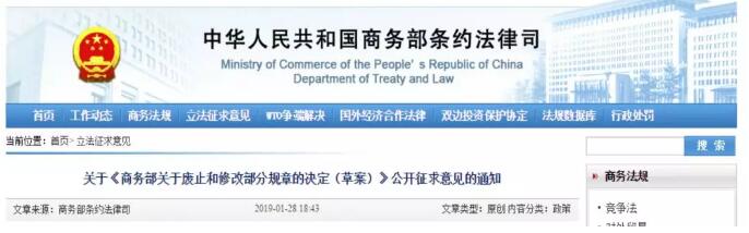 關于《商務部關于廢止和修改部分規章的決定(草案)》公開征求意見的通知 為了進一步推進落實“放管服”改革,開展證明事項清理工作,提高商務部依法行政水平,擬制定《關于廢止和修改部分規章的決定》,現就草案向社會公開征求意見。公眾可以通過以下途徑提出意見: 1.登陸中國法制信息網(網址:http://www.chinalaw.gov.cn),進入首頁左側的“法規規章草案意見征集系統”; 2.登陸商務部條法司網站(網址:http://www.mofcom.gov.cn)進入“立法征求意見”點擊“《關于廢止和修改部分規章的決定(草案)》征求意見”; 3.電子郵件:tfsxzc@mofcom.gov.cn; 4.傳真:010-65198905; 5.信函:北京市東長安街2號商務部條約法律司,郵編:100731。 請在電子郵件主題、傳真首頁和信封上注明“《商務部關于廢止和修改部分規章的決定(草案)》公開征求意見”。 意見反饋截止日期為2019年3月2日。 附件:《商務部關于廢止和修改部分規章的決定(草案)》 商務部條法司 2019年1月28日