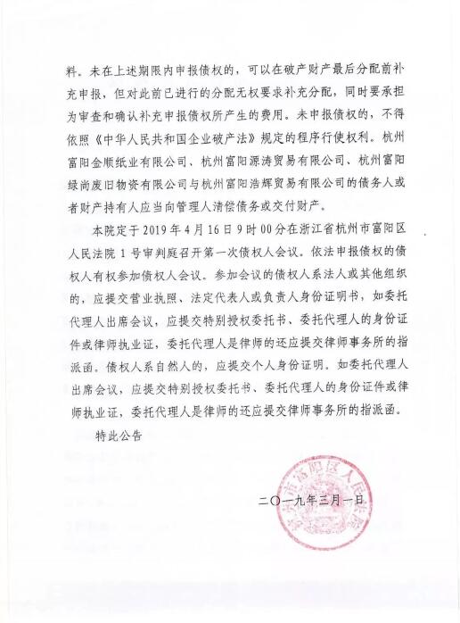 債權人會議時間及地點:2019年4月16日上午9時于杭州市富陽區(qū)人民法院一號審判庭內(nèi)