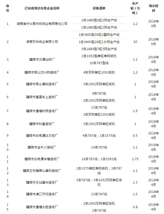3月21日,湖南省淘汰落后產(chǎn)能和企業(yè)兼并重組工作領(lǐng)導(dǎo)小組辦公室公布了《關(guān)于2018年湖南省落后產(chǎn)能退出情況的公告(第一批)》。其中造紙行業(yè)名單中有造紙企業(yè)57家,合計(jì)退出落后產(chǎn)能73.04萬(wàn)噸。
