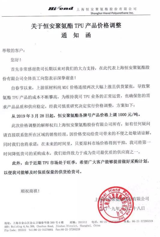 此前,萬華化學曾表示,15000元~18000元/噸的MDI價格對市場、企業和終端客戶而言都是一個比較舒適的價格區間。根據相關數據顯示2018年12月25日至2019年3月25日,3個月內,聚合MDI華東經銷商價格從11575元漲至15000元以上。另據萬華化學三季報顯示,公司還有80億元的存貨。 隨著上游原材料MDI的大幅上漲,目前聚氨酯TPU等產品也因成本攀升,有了跟漲效應,上海恒安聚氨酯股份有限公司日前發布《通知函》稱:自春節以來,上游原材料純MDI價格連續兩次大幅上漲且供貨緊張,導致聚氨酯TPU產品的成本不斷攀高,為維持公司正常運營,也確保下游供貨穩定,從2019年3月28日起,恒安聚氨酯各牌號產品價格上調1000元/噸。