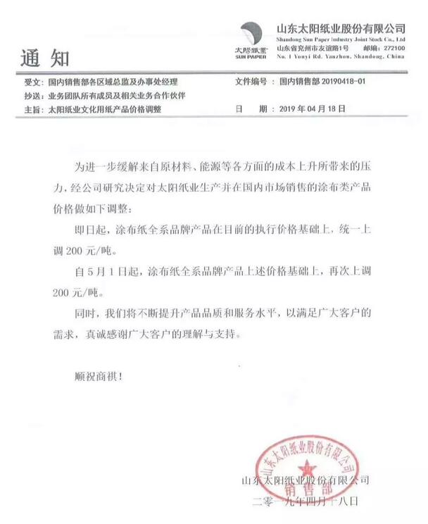 山東太陽紙業(yè):為進一步緩解來自原材料、能源等各方面的成本上升所帶來的壓力,經(jīng)公司研究決定對太陽紙業(yè)生產(chǎn)并在國內(nèi)市場銷售的涂布類產(chǎn)品價格做如下調(diào)整:即日起,涂布紙全系品牌產(chǎn)品在目前的執(zhí)行價格基礎(chǔ)上,統(tǒng)一上調(diào)200元/噸。 自5月1日起,涂布紙全系品牌產(chǎn)品上述價格基礎(chǔ)上,再次上調(diào)200元/噸。