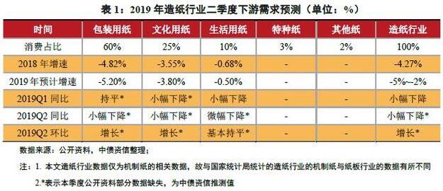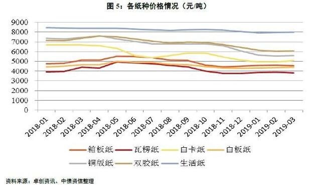 (四)行業(yè)價(jià)格回顧與展望 2019年一季度,除箱板紙龍頭提價(jià)使得箱板紙均價(jià)環(huán)比小幅上漲外,其余包裝紙、文化紙及生活用紙均價(jià)主要受需求減弱影響,環(huán)比均出現(xiàn)一定的下滑,各紙種下滑幅度有所不同,按下滑幅度由大到小依次為銅版紙、雙膠紙、白卡紙、生活用紙、白板紙、瓦楞紙。而各紙種一季度均價(jià)同比均出現(xiàn)較為明顯的下降。 二季度,各紙種價(jià)格走勢不一,箱板瓦楞紙方面,以玖龍紙業(yè)和博匯紙業(yè)為主的新增產(chǎn)能陸續(xù)釋放增加供給壓力,而需求難有實(shí)質(zhì)性好轉(zhuǎn),預(yù)計(jì)供給增速高于需求增速,而成本端廢紙價(jià)格上漲空間對(duì)箱板瓦楞紙價(jià)格支撐有限,預(yù)計(jì)箱板瓦楞紙價(jià)格伴隨供給提升而小幅下滑。白卡紙方面,博匯紙業(yè)75萬噸白卡紙產(chǎn)能投產(chǎn),行業(yè)供給增速大于需求增速,但考慮主要廠家博匯紙業(yè)、太陽紙業(yè)等提價(jià)(4月份已發(fā)布提價(jià)函),預(yù)計(jì)白卡紙均價(jià)環(huán)比小幅上漲的可能性較大。白板紙方面,一季度浙江富陽地區(qū)100萬噸產(chǎn)能出清利好釋放完畢,二季度供需端基本維持,成本端支撐有限,預(yù)計(jì)二季度白板紙均價(jià)環(huán)比持平或微幅上漲。文化紙方面,秋季教材教輔招標(biāo)可為二季度的雙膠紙和銅版紙價(jià)格形成支撐,供給端2019年無文化紙產(chǎn)能投放,銅版紙和雙膠紙均價(jià)環(huán)比上升的可能性較大,但同比仍呈下降趨勢。生活用紙方面,需求具有一定剛性,2018年末投產(chǎn)的產(chǎn)能在2019年一季度已全部釋放,二季度供需關(guān)系可基本維持一季度,而成本端木漿價(jià)格小幅提升形成一定支撐,預(yù)計(jì)二季度生活用紙均價(jià)環(huán)比小幅上漲,同比有所下降。
