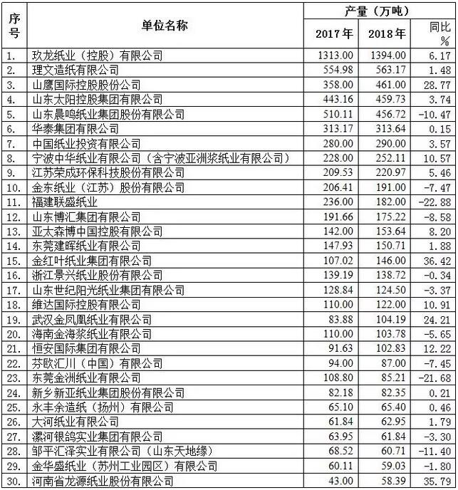 一、紙及紙板生產和消費情況 (一)紙及紙板生產量和消費量 據中國造紙協會調查資料,2018年全國紙及紙板生產企業約2700家,全國紙及紙板生產量10435萬噸,較上年增長-6.24%。消費量10439萬噸,較上年增長-4.20%,人均年消費量為75千克(13.95億人)。2009~2018年,紙及紙板生產量年均增長率2.12%,消費量年均增長率2.22%。 (二)紙及紙板主要產品生產和消費情況 1、新聞紙 2018年新聞紙生產量190萬噸,較上年增長-19.15%;消費量237萬噸,較上年增長-11.24%。2009~2018年生產量年均增長率-9.78%,消費量年均增長率-7.13%。 2、未涂布印刷書寫紙 2018年未涂布印刷書寫紙生產量1750萬噸,較上年增長-2.23%;消費量1751萬噸,較上年增長0.40%。2009~2018年生產量年均增長率1.65%,消費量年均增長率1.76%。 3、涂布印刷紙 2018年涂布印刷紙生產量705萬噸,較上年增長-7.84%;消費量604萬噸,較上年增長-4.73%。2009~2018年生產量年均增長率1.98%,消費量年均增長率3.00%。 其中:銅版紙 2018年銅版紙生產量655萬噸,較上年增長-2.96%;消費量581萬噸,較上年增長-0.68%。2009~2018年生產量年均增長率3.05%,消費量年均增長率4.26%。 4、生活用紙 2018年生活用紙生產量970萬噸,較上年增長1.04%;消費量901萬噸,較上年增長1.24%。2009~2018年生產量年均增長率5.88%,消費量年均增長率6.10%。 5、包裝用紙 2018年包裝用紙生產量690萬噸,較上年增長-0.72%;消費量701萬噸,較上年增長-0.85%。2009~2018年生產量年均增長率2.05%,消費量年均增長率1.99%。 6、白紙板 2018年白紙板生產量1335萬噸,較上年增長-6.64%;消費量1219萬噸,較上年增長-6.16%。2009~2018年生產量年均增長率1.67%,消費量年均增長率0.55%。 其中:涂布白紙板 2018年涂布白紙板生產量1275萬噸,較上年增長-6.93%;消費量1158萬噸,較上年增長-6.46%。2009~2018年生產量年均增長率1.65%,消費量年均增長率0.47%。 7、箱紙板 2018年箱紙板生產量2145萬噸,較上年增長-10.06%;消費量2345萬噸,較上年增長-6.57%。2009~2018年生產量年均增長率2.42%,消費量年均增長率2.93%。 8、瓦楞原紙 2018年瓦楞原紙生產量2105萬噸,較上年增長-9.85%;消費量2213萬噸,較上年增長-7.64%。2009~2018年生產量年均增長率2.30%,消費量年均增長率2.59%。 9、特種紙及紙板 2018年特種紙及紙板生產量320萬噸,較上年增長4.92%;消費量261萬噸,較上年增長4.82%。2009~2018年生產量年均增長率8.78%,消費量年均增長率6.83%。 二、紙及紙板生產企業經濟指標完成情況 據國家統計局統計,2018年1~12月規模以上造紙生產企業2657家;主營業務收入8152億元;工業增加值增速-0.70%;產成品存貨390億元,同比增長14.31%;利潤總額466億元,同比增長-15.05%;資產總計10505億元,同比增長4.58%;資產負債率59.30%,較上年增加3.39個百分點;負債總額6229億元,同比增長6.02%;在統計的2657家造紙生產企業中,虧損企業有543家,占20.44%。 三、紙漿生產和消耗情況 (一)2018年紙漿生產情況 據中國造紙協會調查資料,2018年全國紙漿生產總量7201萬噸,較上年增長-9.41%。其中:木漿1147萬噸,較上年增長9.24%;廢紙漿5444萬噸,較上年增長-13.61%;非木漿610萬噸,較上年增長2.17%。 (二)2018年紙漿消耗情況 2018年全國紙漿消耗總量9387萬噸,較上年增長-6.61%。木漿3303萬噸,占紙漿消耗總量35%,其中進口木漿占23%、國產木漿占12%;廢紙漿5474萬噸,占紙漿消耗總量58%,其中用進口廢紙制漿占16%、用國產廢紙制漿占42%;非木漿610萬噸,占紙漿消耗總量7%。 (三)2018年廢紙利用情況 2018年全國廢紙回收總量4964萬噸,較上年增長-6.07%,廢紙回收率48%,廢紙利用率64%,2009~2018年廢紙回收總量年均增長率3.39%。 四、紙制品生產和消費情況 根據國家統計局數據,2018年全國規模以上紙制品生產企業4003家,生產量5578萬噸,較上年增長-17.98%;消費量5273萬噸,較上年增長-19.04%;進口量18萬噸,出口量323萬噸。2009~2018年,紙制品生產量年均增長率3.99%,消費量年均增長率3.88%。 五、紙及紙板、紙漿、廢紙及紙制品進出口情況 (一)紙及紙板、紙漿、廢紙及紙制品進口情況 2018年紙及紙板進口622萬噸,較上年增長33.48%;紙漿進口2479萬噸,較上年增長4.51%;廢紙進口1703萬噸,較上年增長-33.79%;紙制品進口18萬噸,較上年增長-5.26%。 2018年進口紙及紙板、紙漿、廢紙、紙制品合計4822萬噸,較上年增長-11.18%,用匯302.12億美元,較上年增長15.67%。進口紙及紙板平均價格為888.99美元/噸,較上年平均價格增長-1.36%;進口紙漿平均價格為795.31美元/噸,較上年平均價格增長22.99%;進口廢紙平均價格為252.03美元/噸,較上年平均價格增長10.33%。 (二)紙及紙板、紙漿、廢紙及紙制品出口情況 2018年紙及紙板出口618萬噸,較上年增長-11.59%;紙漿出口9.99萬噸,較上年增長1.22%;廢紙出口0.06萬噸,較上年增長-60.00%;紙制品出口323萬噸,較上年增長5.21%。 2018年出口紙及紙板、紙漿、廢紙、紙制品合計951.05萬噸,較上年增長-6.39%,創匯192.69億美元,較上年增長7.20%。出口紙及紙板平均價格為1408.57美元/噸,較上年平均價格增長13.57%;出口紙漿平均價格為1311.32美元/噸,較上年平均價格增長-3.91%。 (三)紙及紙板主要產品2009~2018年進出口情況 1、新聞紙:2018年進口量大于出口量,凈進口量47萬噸。 2、未涂布印刷書寫紙:2018年進口量大于出口量,凈進口量1萬噸。 3、涂布印刷紙:2018年出口量大于進口量,凈出口量101萬噸。 其中:銅版紙:2018年出口量大于進口量,凈出口量74萬噸。 4、生活用紙:2018年出口量大于進口量,凈出口量69萬噸。 5、包裝用紙:2018