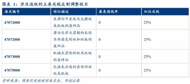 1、廢紙:2018年8月加征關稅涵蓋所有品種,加征關稅稅額為25%