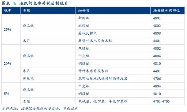 成品紙方面,主要的征稅對象情況為:(1)新聞紙,加征關稅主要為25%;(2)雙膠紙,加征關稅主要為20%和25%;(3)銅版紙:加征關稅主要為5%和20%;(4)箱板瓦楞紙,加征關稅主要為25%;(5)牛皮紙,加征關稅主要為5%和20%。(除上述外,還有其他文化紙、特種紙等)