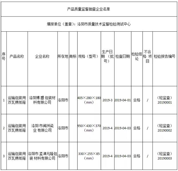 近日,洛陽(yáng)市市場(chǎng)監(jiān)督管理局發(fā)布抽查公告稱(chēng),洛陽(yáng)市質(zhì)量技術(shù)監(jiān)督檢驗(yàn)測(cè)試中心于2019年第1季度,對(duì)全市范圍內(nèi)運(yùn)輸包裝用瓦楞紙箱生產(chǎn)企業(yè)進(jìn)行市監(jiān)督檢查。