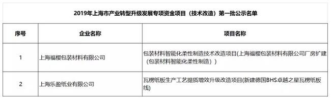 導語:5月28日,上海市經信局發(fā)布2019年上海市產業(yè)轉型升級發(fā)展專項資金項目,上海福櫻包裝材料有限公司和上海樂盈紙業(yè)有限公司的相關項目入圍。