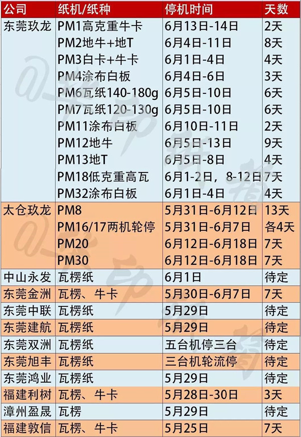 東莞玖龍:11臺紙機將于6月1日起停機,涉及紙種包括牛卡、地牛、涂布白板紙、高瓦。各紙機停機時長2-9天不等,總時長55天。