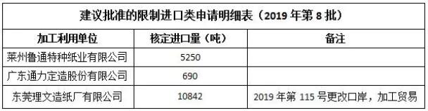 導語:6月11日,生態環境部固廢中心公布了2019年第8批廢紙限制進口許可名單。僅2家紙廠獲得廢紙進口許可,總量為5940噸。 根據生態環境部固廢中心發布的名單,共有3家造紙廠入列,其中東莞理文造紙廠屬于之前批次更改口岸。獲得外廢許可的僅兩家紙廠:一家是萊州魯通特種紙業有限公司獲得5250噸核定進口量,另一家廣東通力定造紙股份有限公司獲得690噸,兩家紙廠合計5940噸。 2019年廢紙進口量暴跌,下半年或將繼續萎縮