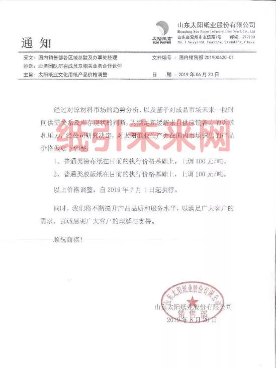 續19日晨鳴、華泰、APP發布調價通知后,20日太陽、岳陽林紙、亞太森博紙業相繼發布漲價通知,文化用紙六大巨頭齊聚,抱團拉漲,旺季是否真的來臨? 山東太陽紙業:經過對原材料市場的趨勢分析,以及基于對成品市未來一段時間供需關系及庫存現狀的判斷,為滿足和緩解來自供應鏈各方的訴求和壓力,經公司研究決定,對太陽紙業生產并在國內市場銷售的產品做如下調整: 1、普通類涂布紙在目前的執行價格基礎上,上調100元/噸。 2、普通類膠版在目前的執行價格基礎上,上調100元/噸。 以上價格調整,自2019年7月1日起執行。
