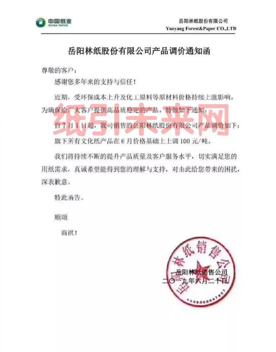 岳陽林紙:近期,受環保成本上升及化工原料等原材料價格持續上漲影響,為確保給廣大客戶提供高品質穩定的產品,特做如下通知: 自7月1日起,我司銷售的岳陽林紙股份有限公司產品調價如下:旗下所有文化紙產品在6月價格基礎上上調100元/噸。