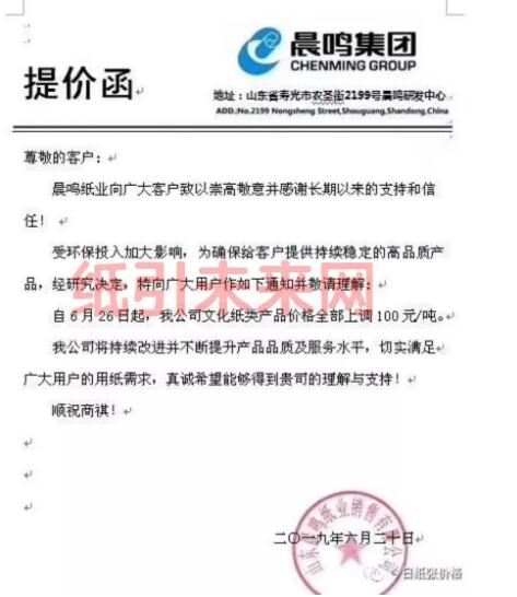 晨鳴紙業:受環保投入加大影響,為確保給客戶提供持續穩定的高品質產品,經研究決定,特向廣大用戶作如下通知并敬請理解: 自6月26日起,我公司文化紙類產品價格全部上調100元/噸。