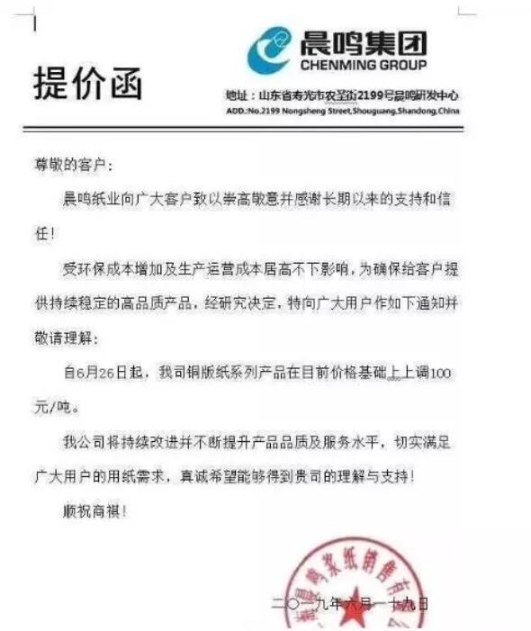 晨鳴紙業:受環保成本增加及生產運營成本居高不下影響,為確保給客戶提供持續穩定的高品質產品,經研究決定,特向廣大用戶作如下通知并敬請理解:自6月26日起,我司銅版紙系列產品在目前價格基礎上上調100元/噸。