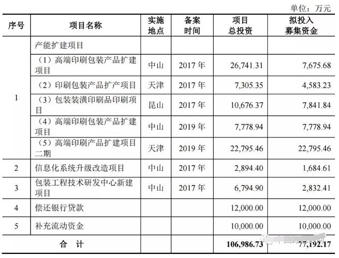 4、高端印刷包裝產品擴建項目(2019年中山) 本項目擬投資人民幣7,778.94萬元,在中山市火炬開發區沿江東三路28號, 通過引進一系列國內外先進智能化生產設備,并配備相應的軟件系統控制,擴大紙制印刷包裝物生產規模。