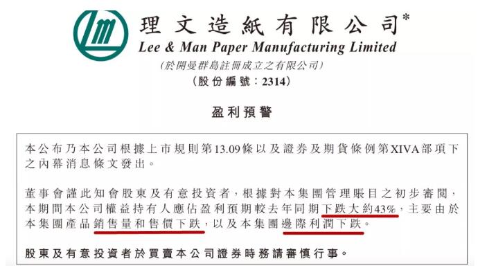 7月29日,理文造紙公告,盈利預期同期下跌大約43%。 7月22日,宜賓紙業公告,預計上半年凈利同期下降92.65%。 下游需求暫未見好轉,小型公司被逼離開,造紙行業整合緩慢。 有機構甚至預測,玖龍紙業的盈利將暴跌53.1%! 面臨上、中、下游多重挑戰,造紙廠跌多跌少已不是問題,只是看誰跌的更慘。 銷售量倒退10%,噸毛利倒退40%至527元,理文盈利預期下跌約43% 7月29日,理文造紙發布公告,公司預計截至2019年6月30日止6個月公司權益持有人應占盈利預期較上年同期下跌大約43%,主要由于該集團產品銷售量和售價下跌。