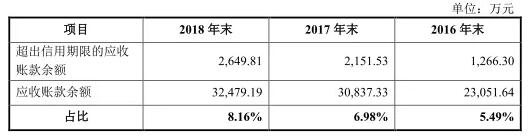 2015年至2018年,大勝達應收賬款余額分別為2.39億元、2.31億元、3.08億元、3.25億元,占當期營業收入的比重分別為23.58%、21.26%、25.49%、25.27%,逾期應收賬款分別為2625.40萬元、1266.30萬元、2151.53萬元、2649.81萬元。公司稱,超出信用期限的應收賬款主要是因為客戶臨時性超期。