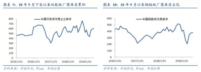 (二)雙膠和銅版等木漿系紙市場持續低迷,庫存未明顯去化 截至8月9日,雙膠紙價格為6192元/噸,環比下降0.13%;銅版紙價格為5833元/噸,與7月價格持平。18年9月中旬以來成品紙市場低迷,銅版和雙膠紙等木漿系紙由于終端低迷,中間環節貿易商及印刷廠主動減少采購,紙廠成品紙庫存累積導致紙價下跌,隨著紙價低迷及成品紙庫存提升,紙廠減少紙漿采購,紙漿貿易商港口庫存累積。