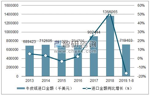 2013-2019年8月中國牛皮紙進口金額趨勢圖