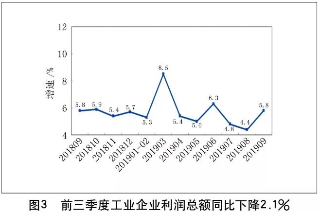 據(jù)世界銀行10月份預(yù)測,2019年全球經(jīng)濟(jì)增長率為2.5%,與1月預(yù)期的2.9%相比有所惡化,比6月份預(yù)測再度調(diào)低。 中央政治局指出,當(dāng)前我國經(jīng)濟(jì)發(fā)展面臨新的風(fēng)險挑戰(zhàn),國內(nèi)經(jīng)濟(jì)下行壓力加大,必須增強(qiáng)憂患意識,把握長期大勢,抓住主要矛盾,善于化危為機(jī),辦好自己的事。 今年1~9月份,規(guī)模以上工業(yè)企業(yè)實(shí)現(xiàn)營業(yè)收入77.67萬億元,同比增長4.5%。1~9月份,全國規(guī)模以上工業(yè)企業(yè)實(shí)現(xiàn)利潤總額45933.5億元,同比下降2.1%。今年前三季度,全國規(guī)模以上工業(yè)增加值同比增長5.6%,處于年度5.5%~6%的預(yù)期目標(biāo)區(qū)間,反映工業(yè)結(jié)構(gòu)調(diào)整和新動能成長的經(jīng)濟(jì)指標(biāo)表現(xiàn)良好。見圖3。