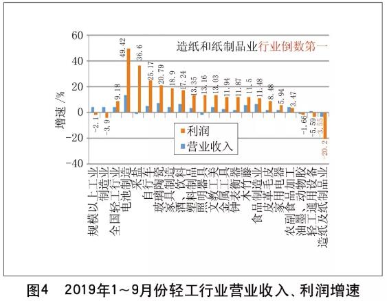 1.2 輕工業(yè)形勢 與上游重化工業(yè)相比,輕工業(yè)發(fā)展形勢良好。生產(chǎn)穩(wěn)中有增,結(jié)構(gòu)調(diào)整有序;利潤快速增長,運(yùn)行質(zhì)量提升;出口增勢平穩(wěn),結(jié)構(gòu)更趨均衡。輕工業(yè)韌性特征顯著,高質(zhì)量發(fā)展成效初顯,不斷滿足人民美好生活需要,為“穩(wěn)外貿(mào)”做出重大貢獻(xiàn)。 輕工業(yè)各項(xiàng)經(jīng)濟(jì)數(shù)據(jù)正增長,高于全國水平。今年1~9月份,規(guī)模以上輕工企業(yè)營業(yè)收入14.59萬億,同比增長4.07%(低于全國工業(yè)0.43個百分點(diǎn));利潤總額9087.52億元,同比增長9.18%(高于全國11.49個百分點(diǎn)11.28百分點(diǎn));利潤率達(dá)到6.24%(高于全國工業(yè)0.33個百分點(diǎn))。輕工業(yè)利潤增速高于營業(yè)增速5.11個百分點(diǎn)。 今年1~8月份,輕工業(yè)實(shí)現(xiàn)出口額同比增長6.34%(高于全國5.94個百分點(diǎn)),輕工出口額占全國總額的27.2%。 輕工業(yè)利潤同比增長近10%,大部分行業(yè)增速超過10%。今年1~9月份,在輕工20個主要行業(yè)中,有13個行業(yè)利潤增速超過10%。家電、食品、酒飲料等行業(yè)主動滿足消費(fèi)升級需求,產(chǎn)品科技含量高,利潤增長較快,其中家電行業(yè)利潤增長14.92%,酒和飲料制造業(yè)利潤增長17.57%,食品制造業(yè)利潤增長12.55%。見圖4。