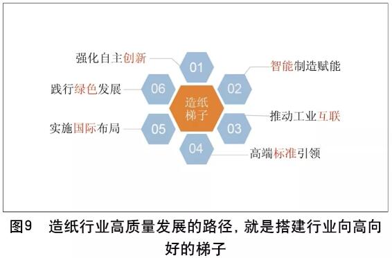 中國造紙為什么低迷,因?yàn)檎谠庥鑫宕罂涨疤魬?zhàn)。 第一,人口負(fù)。清華大學(xué)調(diào)查,大約從2017年起,我們的人口就開始負(fù)增長了,原來判斷中國最高人口16億,現(xiàn)在到14億的時候,清華大學(xué)說已經(jīng)開始負(fù)增長了。我們造紙的生產(chǎn)布局很重要的依據(jù),是人均消費(fèi)量,人口值要漲總產(chǎn)量要漲,現(xiàn)在人口負(fù)增長了這是我們的一個挑戰(zhàn)。 第二,外貿(mào)低。使得我們的包裝類用紙的消費(fèi)量相對減少了。 第三,內(nèi)需緩。2017年一年,我們的國內(nèi)商品零售額一般都是12%、13%的增速,到現(xiàn)在我們下降到7%,下降的比較大。這樣的一個增速,也是最近十幾年來消費(fèi)增長最緩慢的一年。 第四,環(huán)保嚴(yán)。2019年環(huán)保新風(fēng)向,更嚴(yán)、更猛、更廣。 第五,企業(yè)難。造紙圈最近有個新聞,泉林紙業(yè)要破產(chǎn)重組,走到今天這樣子,說明我們行業(yè)確實(shí)是遇到了巨大的困難。 五大挑戰(zhàn)是我們造紙行業(yè)目前低迷的原因。 所以形勢怎么看,總體穩(wěn)健可控,輕工成績亮眼,造紙趨緩下降。 2 我們怎么辦——國家舉措 國家提出來兩條:第一是加快傳統(tǒng)產(chǎn)業(yè)的改造提升,第二要培育強(qiáng)大國內(nèi)消費(fèi)市場。 剛才講了,輕工業(yè)成績亮眼,自然有成績亮眼的道理,整個輕工業(yè)的經(jīng)驗(yàn)值得我們造紙行業(yè)學(xué)習(xí)。我們提出了要向高向好向高質(zhì)量發(fā)展、可持續(xù)發(fā)展。高質(zhì)量發(fā)展是總書記在十九大報告中提出來的,總書記在科技創(chuàng)新,對外開放,一帶一路,區(qū)域振興,智能制造,國企做強(qiáng),民企經(jīng)濟(jì)發(fā)展等多個場合都提出了高質(zhì)量發(fā)展的具體的思路和要求。高質(zhì)量發(fā)展的內(nèi)涵是什么呢?我們覺得有三個方面,第一是從產(chǎn)品層面上來看,這個質(zhì)量要好,要有新產(chǎn)品。第二,從企業(yè)的角度來看,你要有創(chuàng)新活力,要有動力變革,第三,從產(chǎn)業(yè)體系來看,要能夠形成一個要素優(yōu)化的結(jié)構(gòu),能夠通過產(chǎn)學(xué)研結(jié)合,產(chǎn)業(yè)鏈融合集聚發(fā)展,推進(jìn)效率進(jìn)一步的提升。 造紙行業(yè)向高,得有個梯子,梯子在哪里?在此我提六條:第一,強(qiáng)化自主創(chuàng)新;第二,智能制造賦能;第三,推動工業(yè)互聯(lián);第四,高端標(biāo)準(zhǔn)引領(lǐng);第五,實(shí)施國際布局;第六,踐行綠色發(fā)展?萍简(qū)動發(fā)展,創(chuàng)新引領(lǐng)未來,這方面國家做了很多的工作,我們現(xiàn)在搞的好的企業(yè)也都是在創(chuàng)新方面下大力氣的企業(yè)。見圖9。