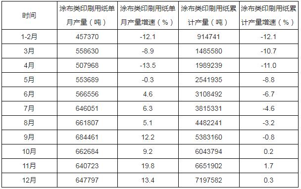 2019年1-12月中國涂布類印刷用紙產量及增速統計表