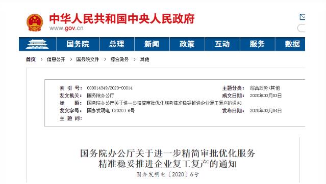 國務院辦公廳關于進一步精簡審批優化服務 精準穩妥推進企業復工復產的通知 國辦發明電〔2020〕6號 各省、自治區、直轄市人民政府,國務院各部委、各直屬機構: 為貫徹落實黨中央關于統籌推進疫情防控和經濟社會發展工作的決策部署,深化“放管服”改革,取消不合理審批,規范審批事項和行為,提供便利服務,精準穩妥推進企業復工復產,現就除湖北省、北京市以外地區復工復產有關事項通知如下: 一、提高復工復產服務便利度 簡化復工復產審批和條件。低風險地區不得采取審批、備案等方式延緩開工。清單之外一律不得實施審批或索要證明,防止出現層層加碼、互為前置審批、循環證明等現象。嚴禁向企業收取復工復產保證金等。對重點行業企業復工復產可設置審批綠色通道,加快提高復工復產率。 優化復工復產辦理流程。企業按規定做好防疫、達到復工復產條件,提交備案信息或承諾書后,即可組織復工復產,相關部門通過開展事后現場核查等,確保企業全面落實各項防疫措施。 二、大力推行政務服務網上辦 抓緊梳理一批與企業復工復產、群眾生活密切相關的政務服務事項,率先實現全程網辦。 依托全國一體化政務服務平臺統一受理政務數據共享需求,優化數據共享流程,按照“急用先行、分批推動,成熟一批、共享一批”的原則,對地方和部門在疫情防控、復工復產等工作中急需的政務數據,加快推動實現共享。 三、完善為復工復產企業服務機制 重點抓好核心配套供應商等產業鏈關鍵環節企業復工復產,帶動上下游中小企業復工復產。 四、及時糾正不合理的人流物流管控措施 非疫情防控重點地區原則上不得限制返崗務工人員出行。對確需開具健康證明的,相關地區要大力推進健康證明跨省互認,勞動力輸出地可對在省內連續居住14天以上、無可疑癥狀且不屬于隔離觀察對象(或已解除隔離觀察)的人員出具健康證明,輸入地對持輸出地(非疫情防控重點地區)健康證明、乘坐“點對點”特定交通工具到達的人員,可不再實施隔離觀察。 五、加強對復工復產企業防疫工作的監管服務 國務院辦公廳 2020年3月3日 交通部:要求精準復工,防止“半拉子”工程 為推動全國各地復工復產相關要求,交通運輸部副部長劉小明3月6日表示,公路經營企業確實急需政策的支持。按照國務院的要求,交通運輸部已經會同多部委研究制定了相關的支持保障政策。主要包括:免費通行期間,對經營主體金融債務還本付息存在困難的給予延緩付息、本金展期或者續貸等政策,為企業提供流動資金的優惠貸款以及適當延長收費公路收費期限等方面,這些政策經批準以后會盡快實施。 交通運輸部近日也印發關于進一步做好公路水運工程疫情防控有序精準推動復工開工的通知。通知明確,要精準復工復產,避免在建項目長時間停工造成損失浪費,防止形成“半拉子”工程。 為了響應國家號召,各省也積極響應,消除一切復工障礙,保障各省市重點項目的順利實施,工人返崗,工地開工,物流開設“綠色通道”。 河北省 3月5日,河北省重點建設領導小組辦公室印發《關于加快重點項目開復工的通知》,通知要求協助有關部門有序組織人員返崗,督促有關部門加快對重點項目建設返崗人員的健康狀況進行評估,符合條件的人員即可上崗,切實加快推進項目建設進度。暢通物流運輸,對重點項目建設所需原材料、設備等要保持物流暢通,嚴禁擅自設卡攔截,斷路堵路,阻斷交通;涉及跨市物流運輸需辦理通行證的,要及時幫助企業辦理;配合有關部門積極協調推進重點項目配套生產企業、生產性物流倉儲企業及相關商貿企業復工復產,保障重點項目順利實施。 上海市 3月4日,上海市住建委今天印發《關于進一步統籌推進建筑工地疫情防控和復工復產工作的通知》,切實把思想認識統一到統籌疫情防控和經濟社會發展的新要求上業,做到“兩手抓、兩手硬”,一手堅持抓好建筑工地疫情防控,保持思想上不松懈,落實好復工條件,全面鞏固、確保前期防控工作取得的成效;一手有力抓好那條業復工復產,鼓勵、推動企業千方百計創造條件,對于符合條件的工地,應復盡復、能復盡復,推進上海市建筑工地加快復工。上海市重大工程必須在3月底之前全面復工。 海南省 記者從省住房和城鄉建設廳獲悉,為加快推進海南省建筑工地復工、開工,省住建廳出臺獎勵政策,對建筑工地加快復工或開工給予誠信獎勵及優化施工許可服務。對復工項目予以誠信加分,3月1日前復工,且日均在崗人數不少于50人的項目;3月10日前復工,且日均在崗人數不少于100人的項目;3月20日前復工,且日均在崗人數不少于200人的項目,加誠信分3分,有效期1.5年。3月1日前復工,且日均在崗人數不少于30人的項目;3月10日前復工,且日均在崗人數不少于80人的項目;3月20日前復工,且日均在崗人數不少于120人的項目,加誠信分2分,有效期1年。2020年2月1日以來的新開工項目按照復工項目誠信加分標準予以加分。 黑龍江省 近日,黑龍江省住房和城鄉建設廳發布通知,明確提出,科學組織人員返崗開(復)工,建筑工地開(復)工前做到“七有”,開(復)工后做到“十必須”,施工現場信息化管理做到“三到位”,現場人員管理做到“三嚴禁”。同時在企業用工、防疫物資儲備、建筑材料運輸等方面提供服務保障,確保項目按計劃開(復)工。 河南省 河南省住