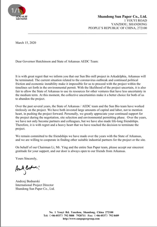 據(jù)美國媒體ArkansasTimes當?shù)貢r間3月16日消息,太陽紙業(yè)已經(jīng)宣布取消其在美國阿肯色州漿紙投資項目。而一個月前,已有美國媒體表示該項目已經(jīng)擱置,當?shù)刂殖鍪墼擁椖坑玫亍?/p> 3月15日,太陽紙業(yè)國際項目總監(jiān)AndrzejBednarski致信阿肯色州州長Hutchinson以及阿肯色州經(jīng)濟發(fā)展委員會(AEDC),表示將終止在該州計劃的SunBio工廠項目。