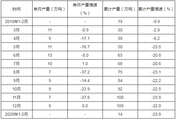 根據國家統計局數據顯示:2020年1-2月中國新聞紙產量為14萬噸,同比下降23.8%;2019年1-12月中國新聞紙產量為109萬噸,同比下降22%。