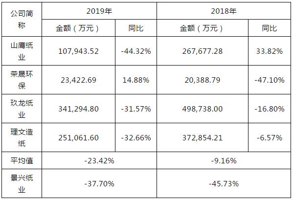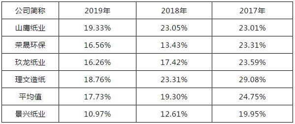 數(shù)據(jù)來源:Wind,山鷹紙業(yè)尚未公告年報,2019年扣非后歸母凈利潤金額及同比變動情況為2019年前三季度數(shù)據(jù),另玖龍紙業(yè)年度報告財務(wù)報告期為上年六月末至本年六月末,已相應(yīng)調(diào)整。 2018年、2019年,同行業(yè)可比上市公司扣非后歸母凈利潤整體呈下降趨勢。具體情況如下: (1)玖龍紙業(yè)、理文造紙2018年度及2019年度扣非后歸母凈利潤同比均有所下降,與公司變動趨勢一致。此外,2018年度玖龍紙業(yè)、理文造紙扣非后歸母凈利潤同比降幅分別為-16.80%、-6.57%,相對低于公司同期下降幅度,主要系該兩家公司當(dāng)年度營業(yè)收入增幅分別達25.85%、24.61%,遠高于公司同期營收增幅所致。 2018年度,玖龍紙業(yè)、理文造紙與公司工業(yè)包裝原紙產(chǎn)品平均售價同比分別上升8.07%、10.05%和8.93%,基本保持一致,上述營收規(guī)模變動差異主要系各公司產(chǎn)品銷量變動差異導(dǎo)致。2018年度,公司生產(chǎn)經(jīng)營較為穩(wěn)健,工業(yè)包裝原紙產(chǎn)品銷量增幅為3.47%;而玖龍紙業(yè)當(dāng)年度產(chǎn)品銷量受國內(nèi)銷量提高以及越南基地項目投產(chǎn)、美國漿廠收購等因素影響,同比增長達16.39%;理文造紙當(dāng)年度包裝紙銷量增長6.81%,同時衛(wèi)生紙產(chǎn)品受江西廠房新生產(chǎn)線投產(chǎn)影響,相關(guān)產(chǎn)品銷量大幅增長70.74%。 (2)山鷹紙業(yè)2018年度扣非后歸母凈利潤同比大幅上升,與行業(yè)趨勢相反,主要系其于2018年1月收購福建省聯(lián)盛紙業(yè)有限責(zé)任公司并納入合并報表范圍,包裝原紙產(chǎn)銷規(guī)模有所擴大所致,同時2017年10月收購的北歐紙業(yè)全年并表,業(yè)績開始體現(xiàn)。2019年前三季度山鷹紙業(yè)扣非后歸母凈利潤亦同比下降。 (3)榮晟環(huán)保2019年度扣非后歸母凈利潤同比上升,與行業(yè)趨勢相反,主要系其2018年度扣非后母凈利潤規(guī)模相對較低,除產(chǎn)品原材料價差縮小導(dǎo)致營業(yè)毛利減少這一行業(yè)共性因素以外,還存在鍋爐檢修導(dǎo)致部分生產(chǎn)線短期停產(chǎn),以及實施和終止股權(quán)激勵計劃確認4,173.60萬元管理費用等其他因素,因此2019年扣非后歸母凈利潤相較同期反而有所上升。 整體而言,受行業(yè)整體景氣程度影響,同行業(yè)可比公司2018年以來經(jīng)營業(yè)績均不同程度有所下滑,考慮以上因素后,公司2018年及2019經(jīng)營業(yè)績的變動趨勢與行業(yè)基本一致。 毛利率