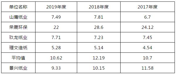 數(shù)據(jù)來源:各公司公告整理,山鷹紙業(yè)尚未披露年報,表格中為2019年前三季度數(shù)據(jù),另玖龍紙業(yè)年度報告財務(wù)報告期為上年六月末至本年六月末,已相應(yīng)調(diào)整。 報告期內(nèi),同行業(yè)可比公司綜合毛利率的變動趨勢與公司基本一致,自2017年行業(yè)景氣度高點之后均呈下降趨勢。 報告期內(nèi),公司綜合毛利率低于同行業(yè)可比公司平均水平,主要系成本結(jié)構(gòu)、產(chǎn)品類型等方面存在差異。 第一,公司的電力和蒸汽全部對外采購,電力、蒸汽按照市場價格結(jié)算,而玖龍紙業(yè)、山鷹紙業(yè)、榮晟環(huán)保等上述同行業(yè)公司多自建電廠,發(fā)電過程中產(chǎn)生的熱蒸汽可以傳輸至造紙車間設(shè)備烘干部進行烘干,多余的電、汽亦可對外供應(yīng)產(chǎn)生利潤。擁有自備電廠的公司進行熱電聯(lián)產(chǎn)降低了造紙的能源成本,提高了這些公司的整體毛利率。 由于榮晟環(huán)保業(yè)務(wù)結(jié)構(gòu)與公司相似度最高,與公司所在地域接近,故以榮晟環(huán)保為例分析無自建電廠對公司毛利率的影響。2017年、2018年及2019年,榮晟環(huán)保外銷蒸汽毛利率分別達30.73%、31.52%、38.23%。假設(shè)以單位能源成本下降30%測算,則公司報告期內(nèi)各期工業(yè)包裝原紙產(chǎn)品的毛利率將相應(yīng)提高3-4個百分點。考慮上述成本因素后,公司工業(yè)包裝原紙產(chǎn)品毛利率與同行業(yè)上市公司平均水平基本一致,不存在重大差異。 第二,公司與上述同行業(yè)上市公司在產(chǎn)品結(jié)構(gòu)上存在一定差異。同行業(yè)可比公司中,以山鷹紙業(yè)為例,其除箱板原紙業(yè)務(wù)外還涉及文化紙、新聞紙等,且于2017年10月收購北歐紙業(yè),涉足高毛利的高端特種紙細分市場,推高了2017年以后該公司的整體毛利率。其次,盡管上述選取的同行業(yè)公司與公司主營業(yè)務(wù)均包括牛皮箱板紙、瓦楞原紙等工業(yè)包裝原紙以及紙箱紙板制品等相關(guān)業(yè)務(wù),但具體產(chǎn)品結(jié)構(gòu)也存在一定差異。 存貨周轉(zhuǎn)率